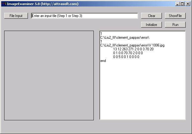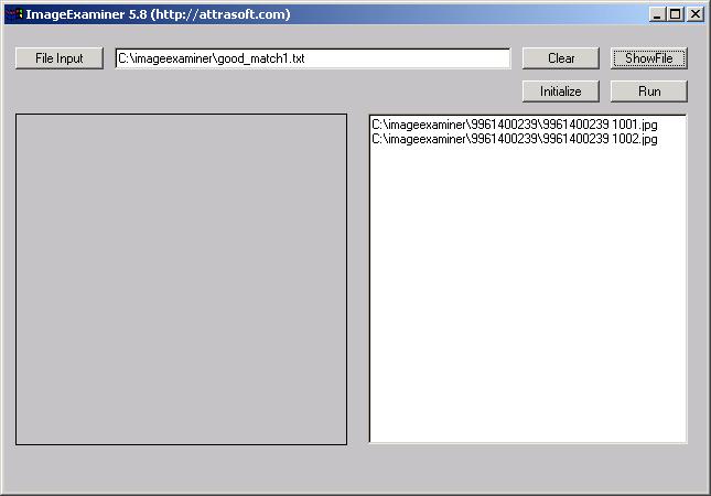 Use the �Initialize� button to initialize the software. You must click the �Initialize� button. After the software is started, you only need to click it once.File InputUse the �File Input� button to select the input file.ShowFileUse the �ShowFile� button to see the content of the input file.ClearUse the �Clear� button to clear the text window.RunUse the �Run� button to match images in the input file.All of the ImageFinder parameters and options in the ImageExaminer are hidden; users have no control of the parameters. The parameters must be tuned in a customized version.